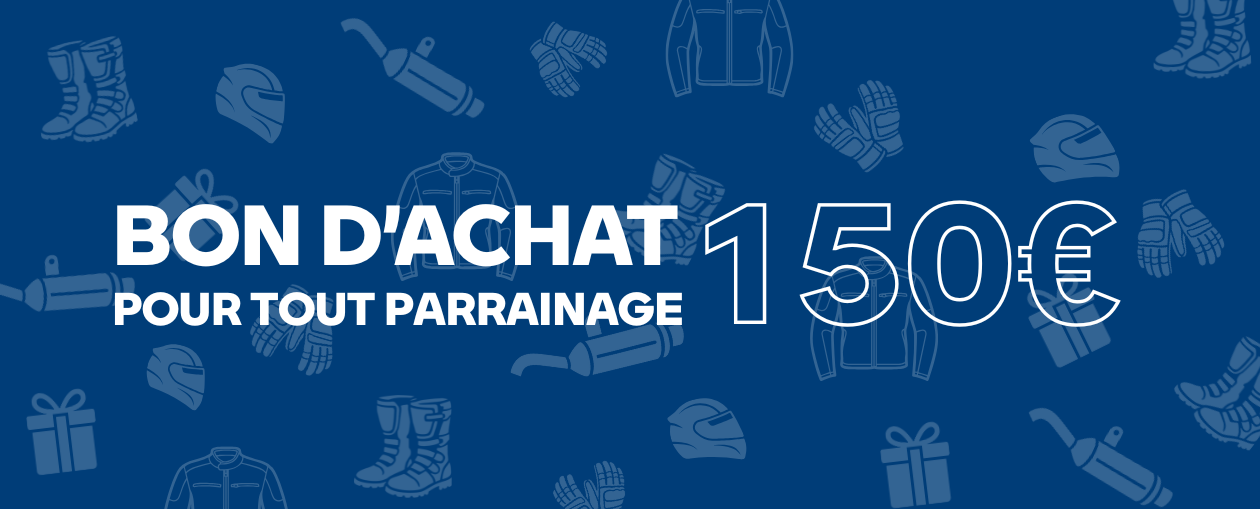 Jusqu'au 31 mars, recevez un bon d'achat de 150€ pour chaque parrainage de l’un de vos proches, ami(e)s ou collègues, qui achète une moto neuve ou d’occasion au sein de l'une des concessions BMW Motorrad du Groupe BMS. devenez son parrain et repartez avec un bon cadeau de 150€ valable pour n'importe quel achat : équipement du pilote, moto neuve ou d'occasion, maintenance, BMW Motorrad Experience.